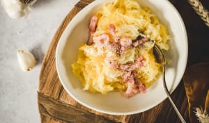 . 10 cl de crème fraîche. Ancienne variété régionale de courge musquée la sucrine du Berry se reconnaît grâce à sa forme en poire et sa couleur verte virant au beige cuivré à maturité. 200 gr de lardons fumés 12 cuillères à soupe de fromage râpé.